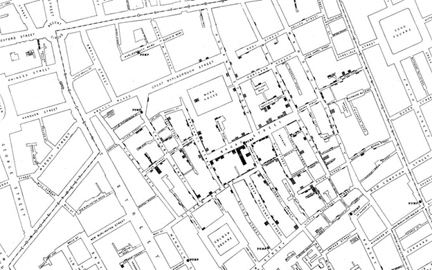 Map by Dr. John Snow showing cholera outbreak deaths (marked with black) in Soho, London, England 1854.